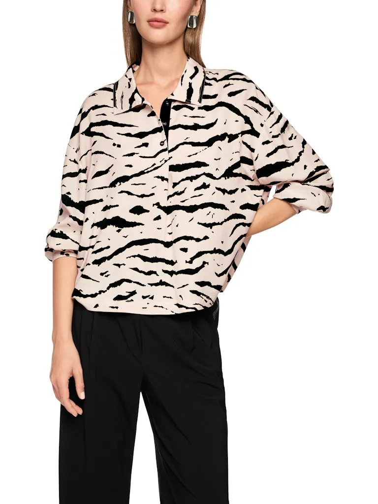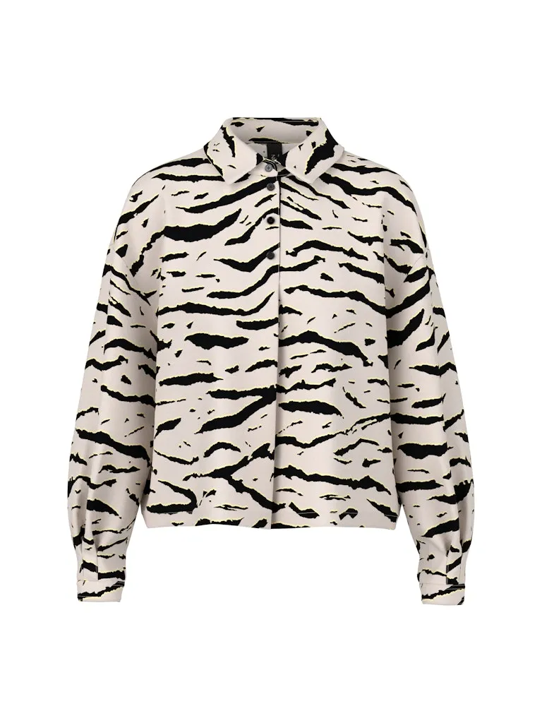 Blouse femme légère et aérienne en 100 % viscose, à imprimé animalier. Coupe ample avec épaules tombantes, col classique et patte de boutonnage discrète. Modèle responsable labellisé Rethink Together.