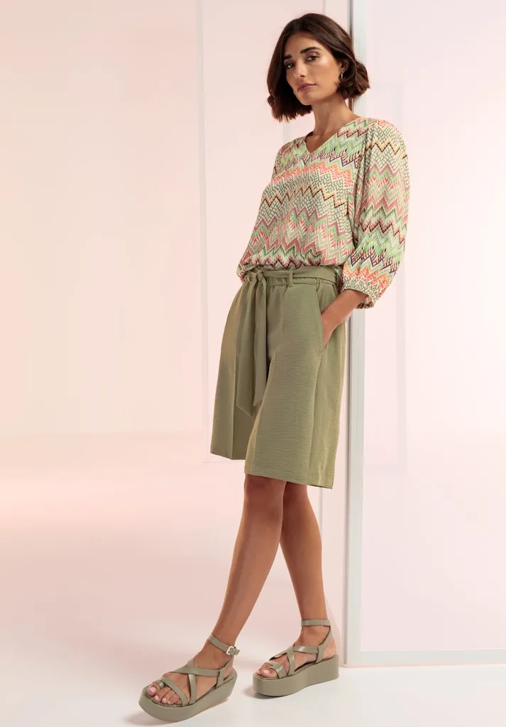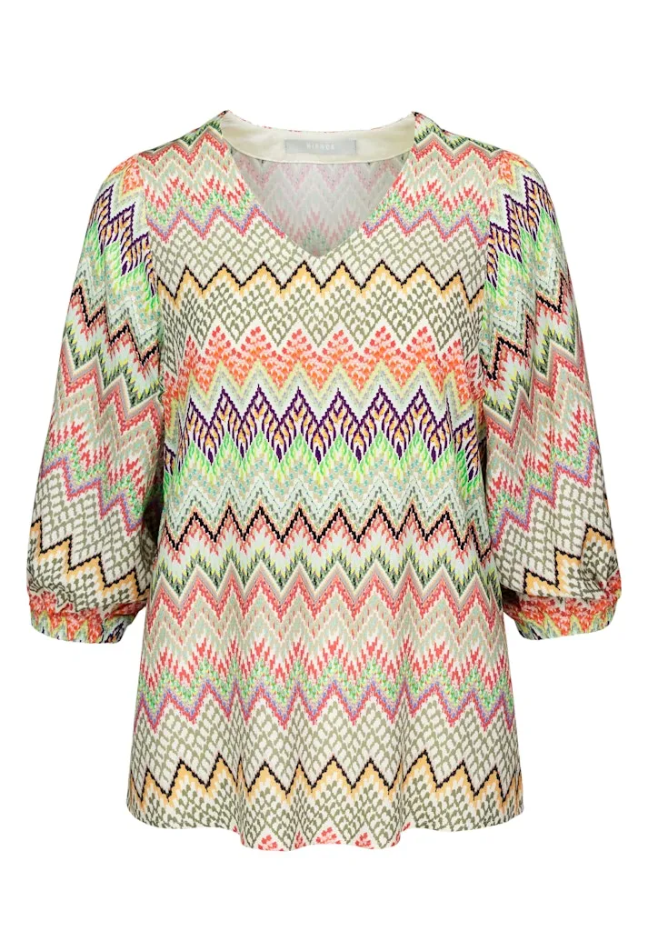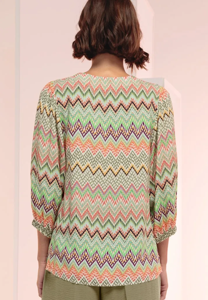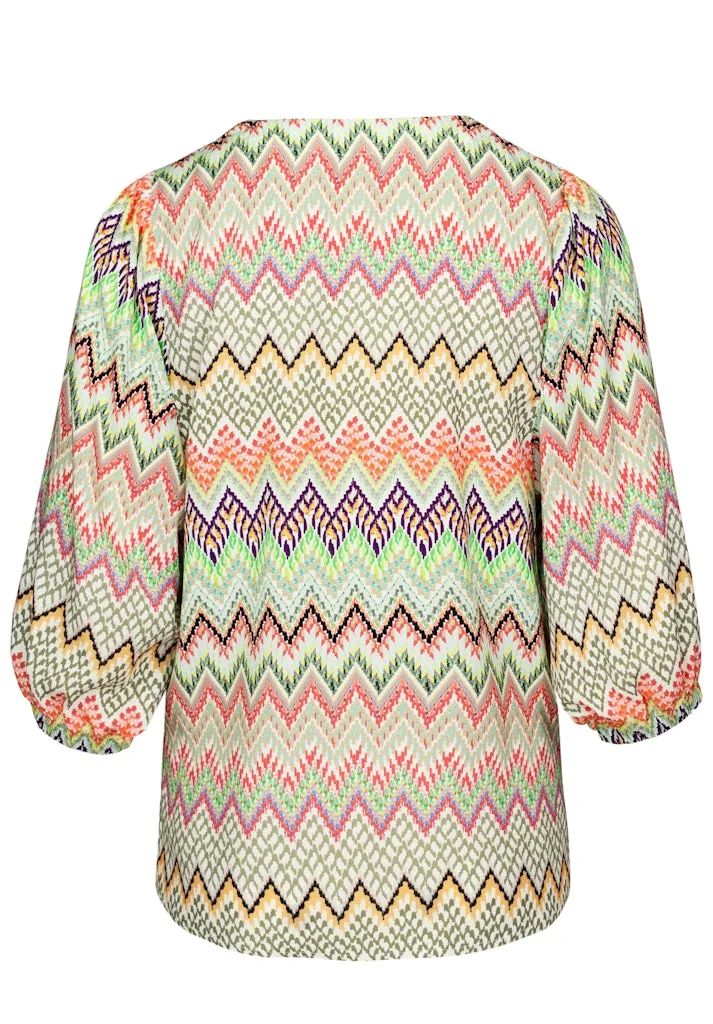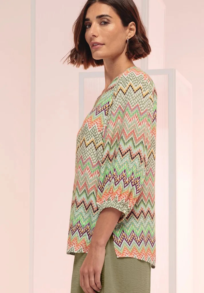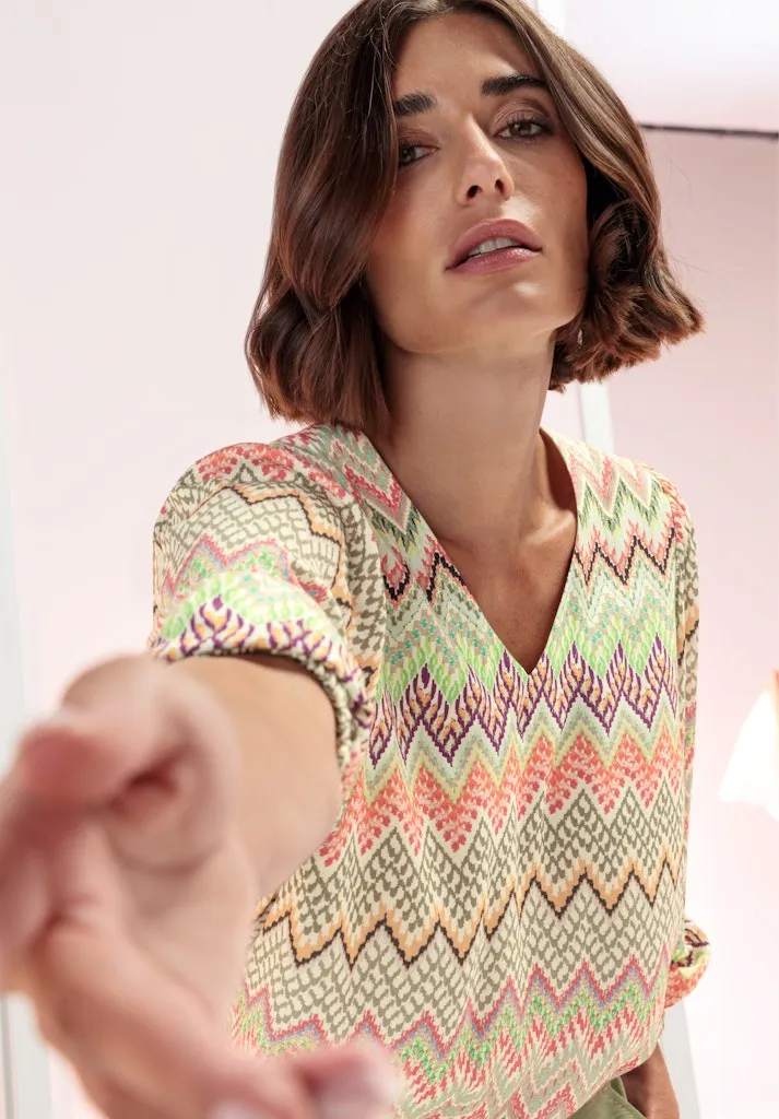 Blouse Col V Manches Trois-quarts Elastiques Fluide Imprimée