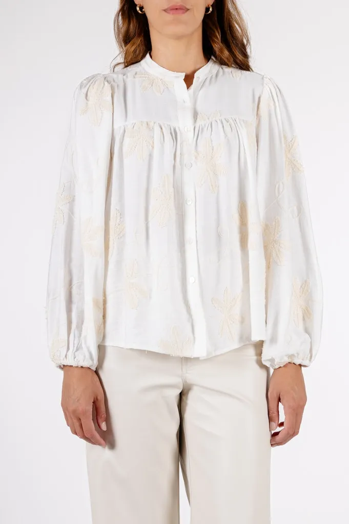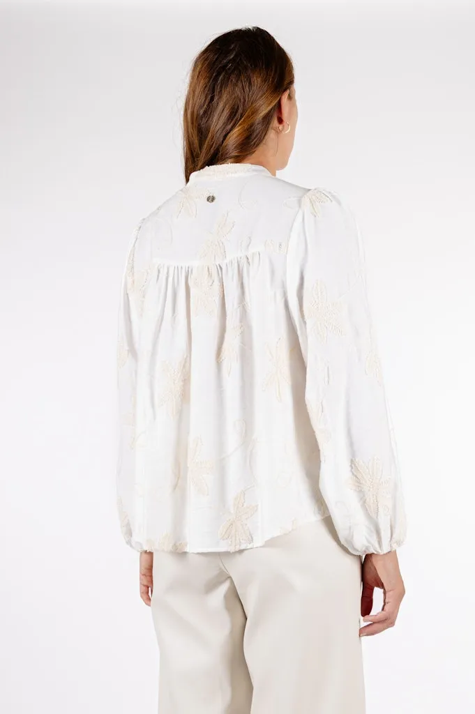 Blouse légère et fluide, confectionnée dans une matière douce au tombé élégant. Ses fronces délicates au-dessus de la poitrine, son col rond et ses manches longues ballon volumineuses à poignets élastiqués créent une silhouette féminine. La broderie florale ton sur ton apporte une touche romantique et raffinée.