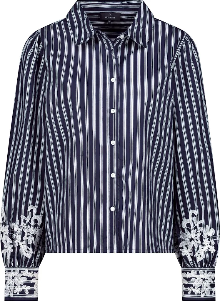 Chemise en 100 % coton, ornée de rayures fines, dentelle délicate et plis nervurés sur les manches pour une touche féminine et raffinée. Son col chemise classique, sa patte de boutonnage, ses manches longues et son pli au dos assurent une coupe régulière confortable et structurée.