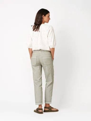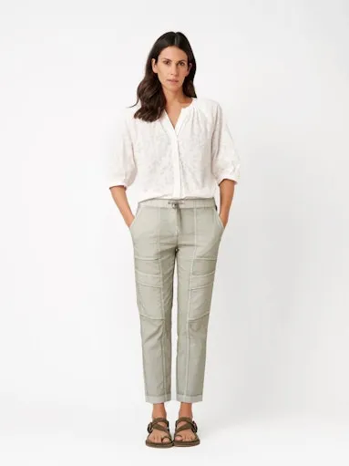 Le pantalon sept-huitème revisite l’esprit utilitaire avec une ligne épurée et un effet subtilement délavé pour une allure contemporaine. Sa taille moyenne élastiquée avec cordon de serrage assure confort et maintien tout en conservant une silhouette nette. Doté de poches latérales, d’une poche cargo sur le devant et de poches plaquées au dos, ce pantalon sept-huitième associe fonctionnalité et modernité. Sa jambe slim dynamise la silhouette et facilite les associations du quotidien.