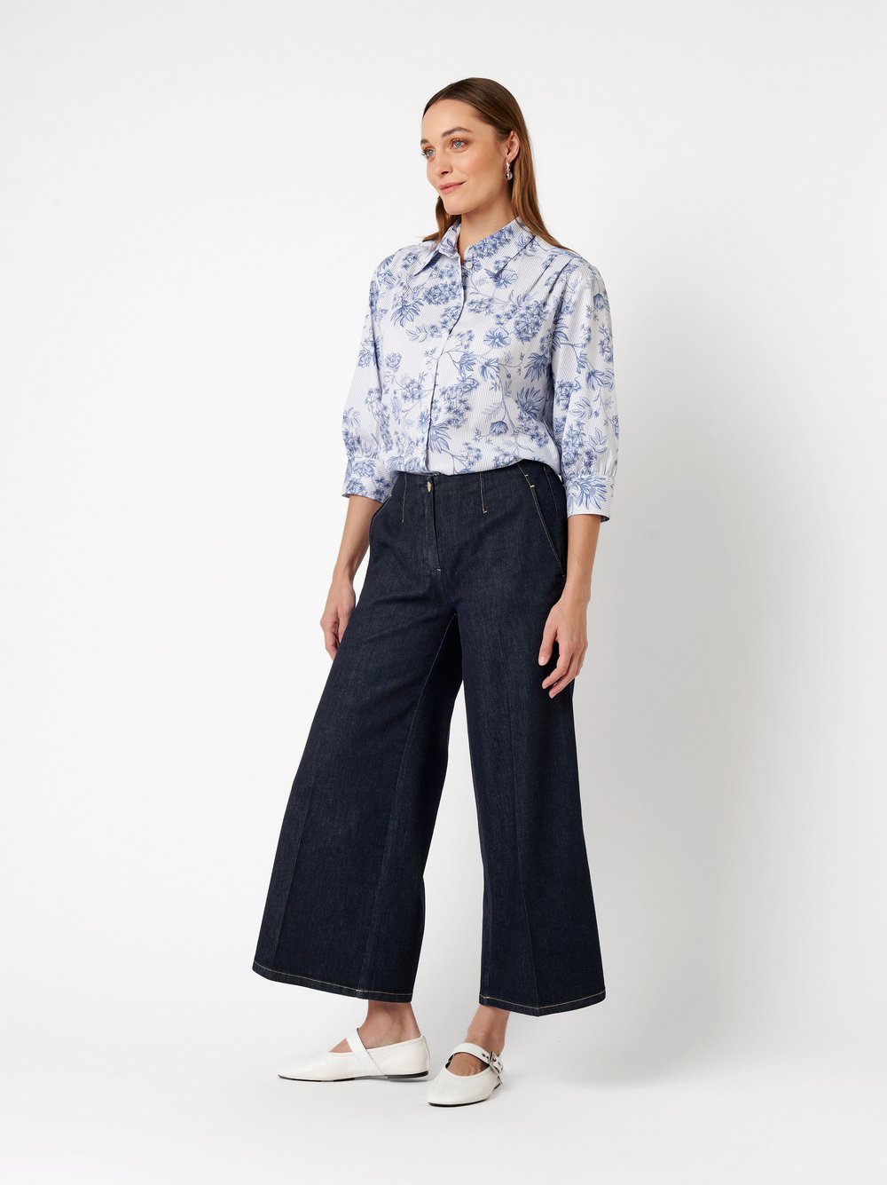 Le pantalon jean culotte séduit par sa ligne épurée et sa taille mi-haute élastiquée structurée avec pinces et découpes précises. Confectionné en denim léger et confortable, ce pantalon présente une jambe large et une longueur sept-huitième qui dessinent une silhouette moderne. Doté de poches latérales et de fausses poches passepoilées au dos, il allie style contemporain et aisance au quotidien.