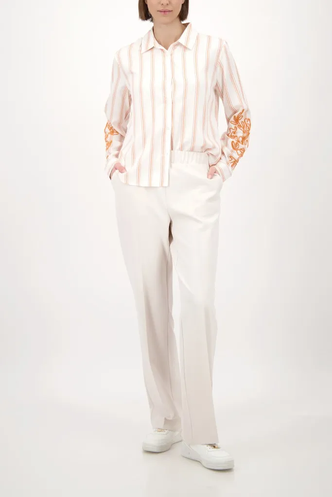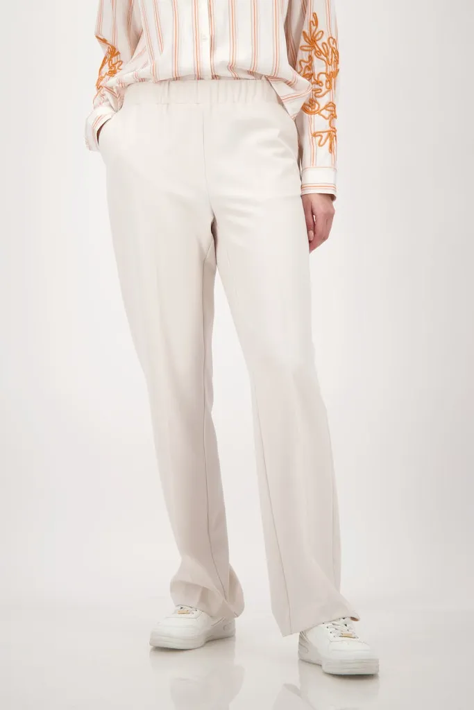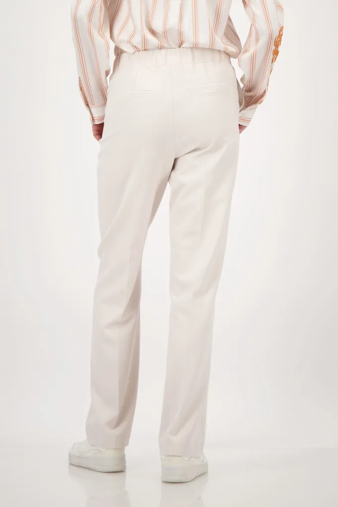 Ce pantalon à jambe droite conjugue allure structurée et confort grâce à sa matière élastique au toucher doux. Les plis marqués apportent une note tailleur contemporaine, tandis que la taille élastiquée assure un ajustement souple au quotidien. Doté de poches latérales pratiques et de fausses poches au dos, il compose une silhouette nette et polyvalente, idéale du bureau aux sorties en ville.