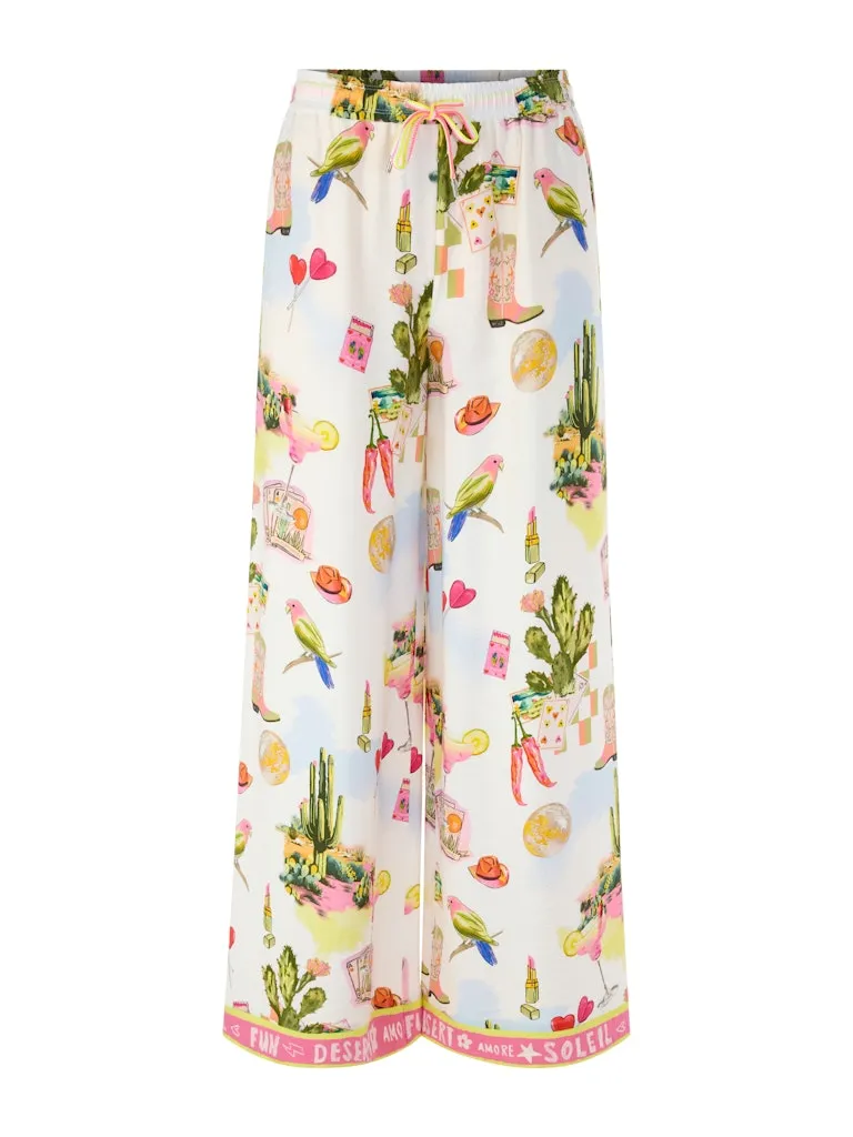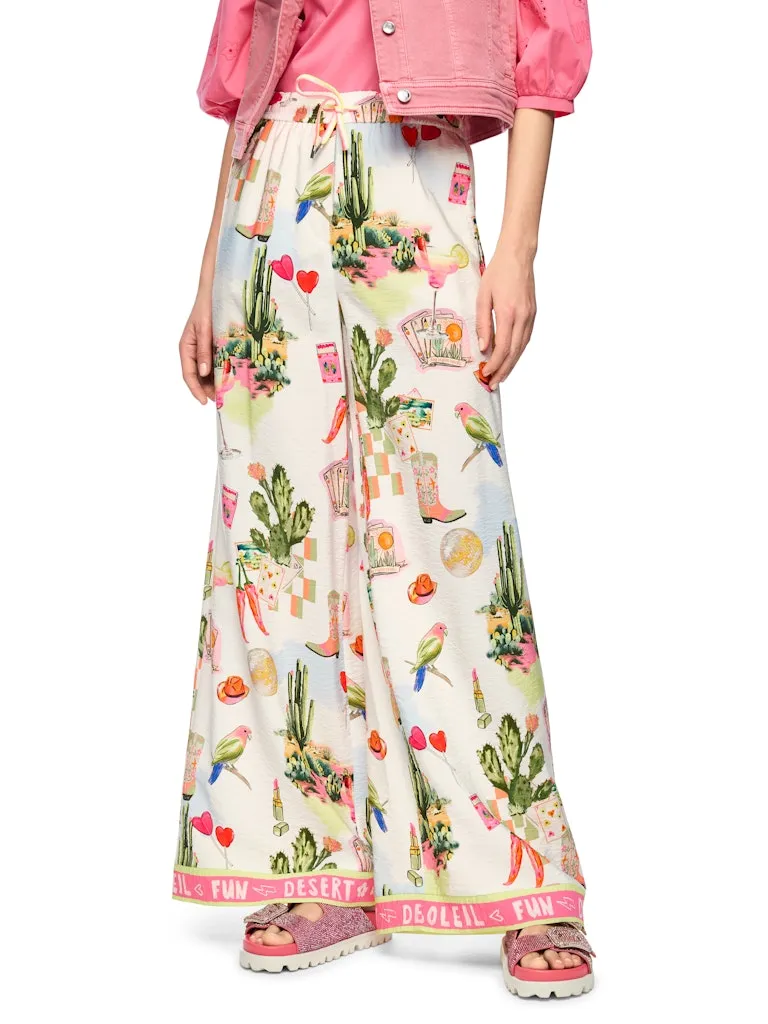 Pantalon Long Taille Moyenne Elastique Cordons Deux Poches Wide Legs Imprimé Fluide Doublé