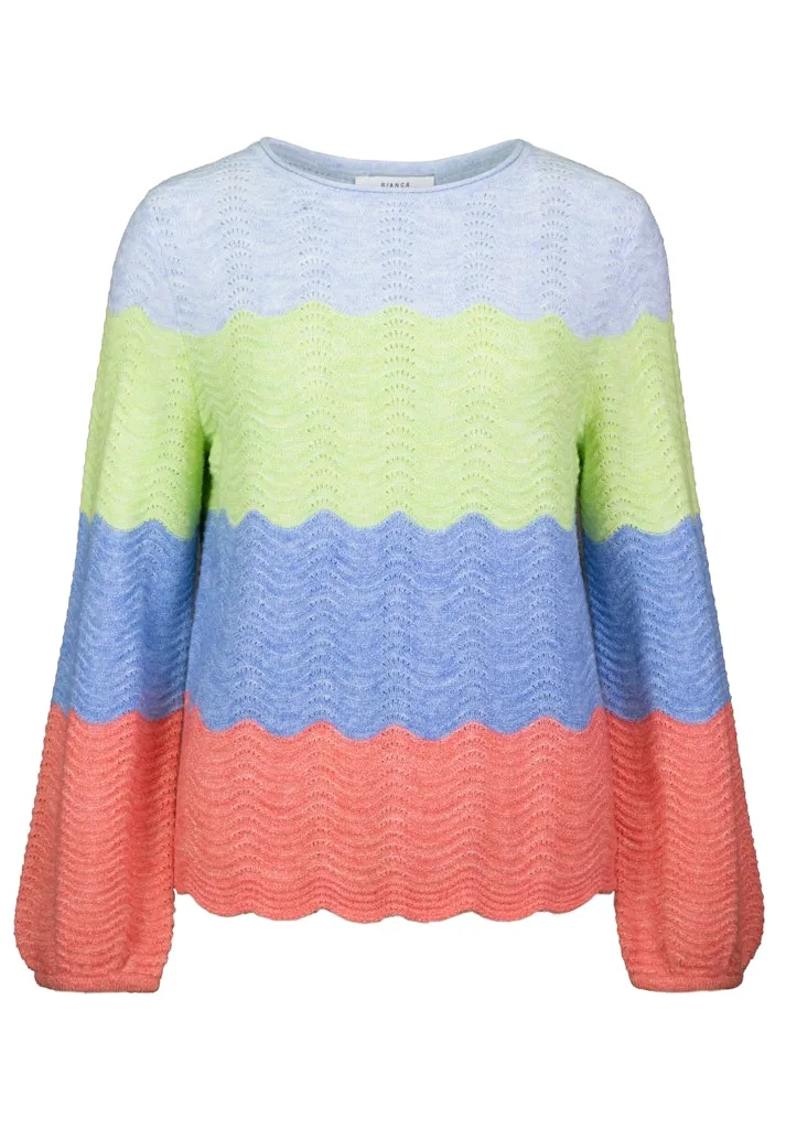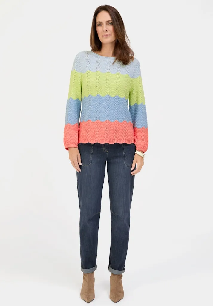 Pull Col Rond Manches Longues Dessin Vagues Ajouré Multicolores Maille Mousse