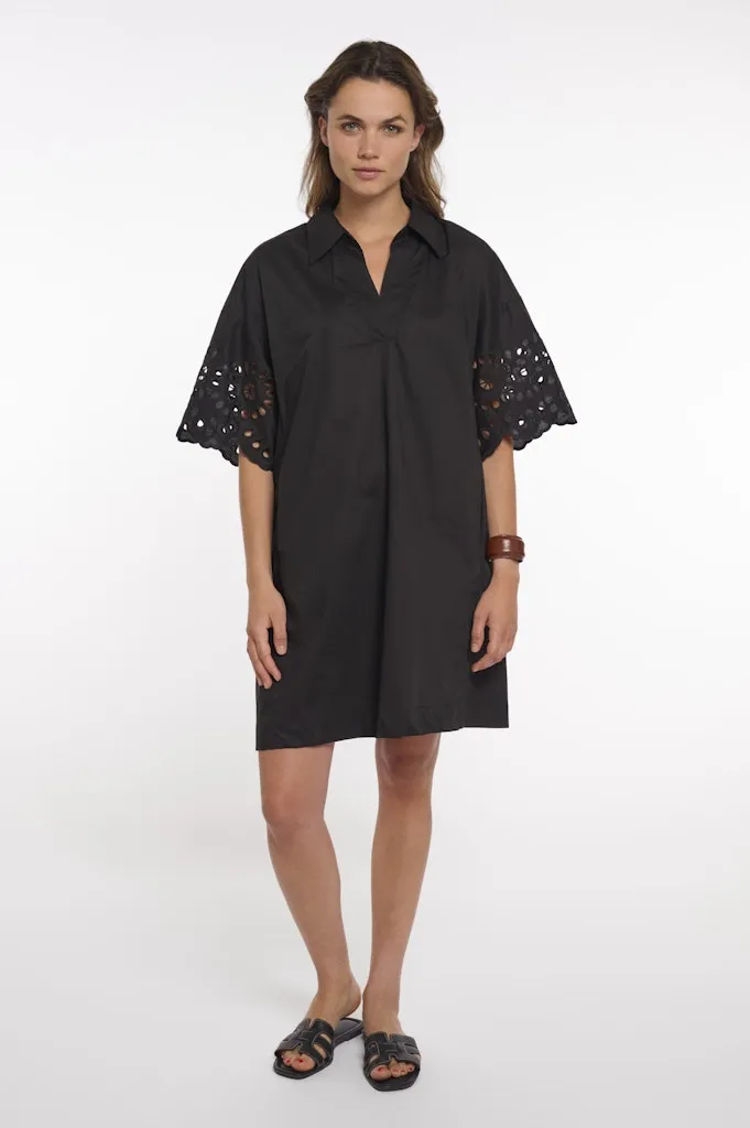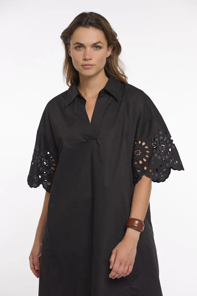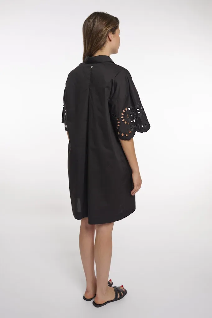 Robe Longueur Genoux Col Chemise Manches Coudes Broderie Evasée Deux Poches Unie Coton
