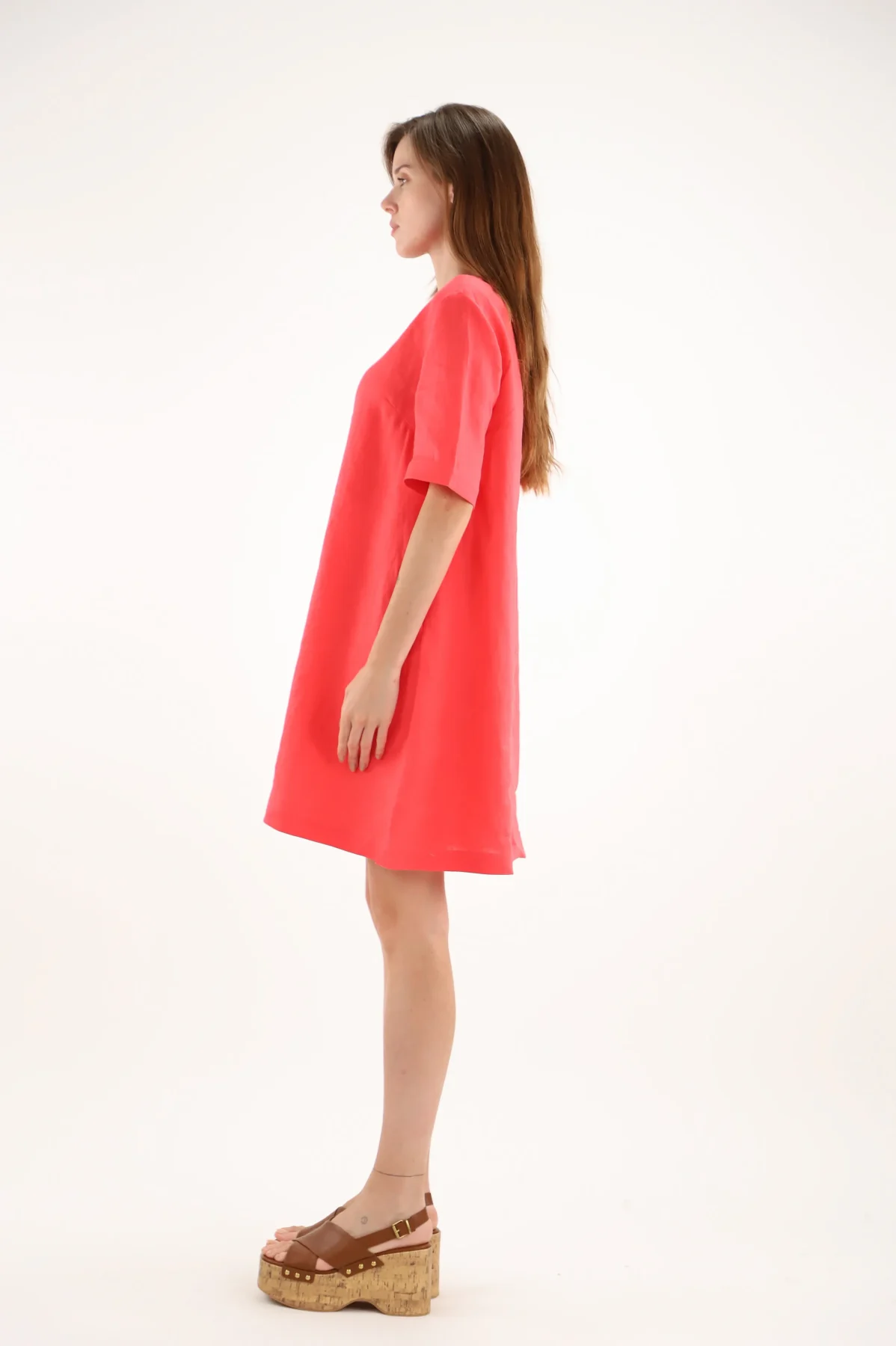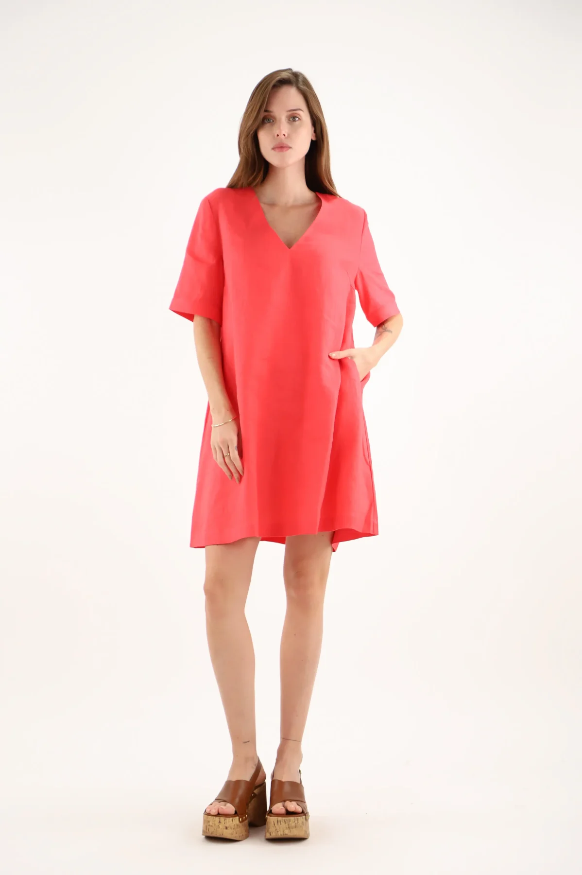 Robe Longueur Genoux Col V Manches Courtes Deux Poches Unie Lin