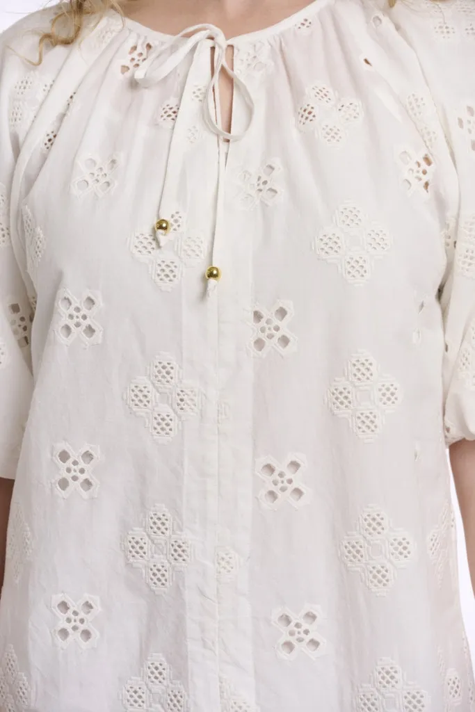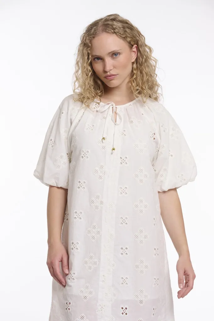 Cette robe longueur genoux adopte une silhouette droite et aérienne, idéale pour les journées ensoleillées. Les manches coudes volumineuses apportent du caractère, tandis que les détails ajourés délicats offrent légèreté et respirabilité. L’encolure v est sublimée par de fins cordons à nouer, ornés de petites détails en métal, ajoutant une touche raffinée. L’ourlet subtilement festonné et la doublure intégrée assurent confort et finition soignée.
