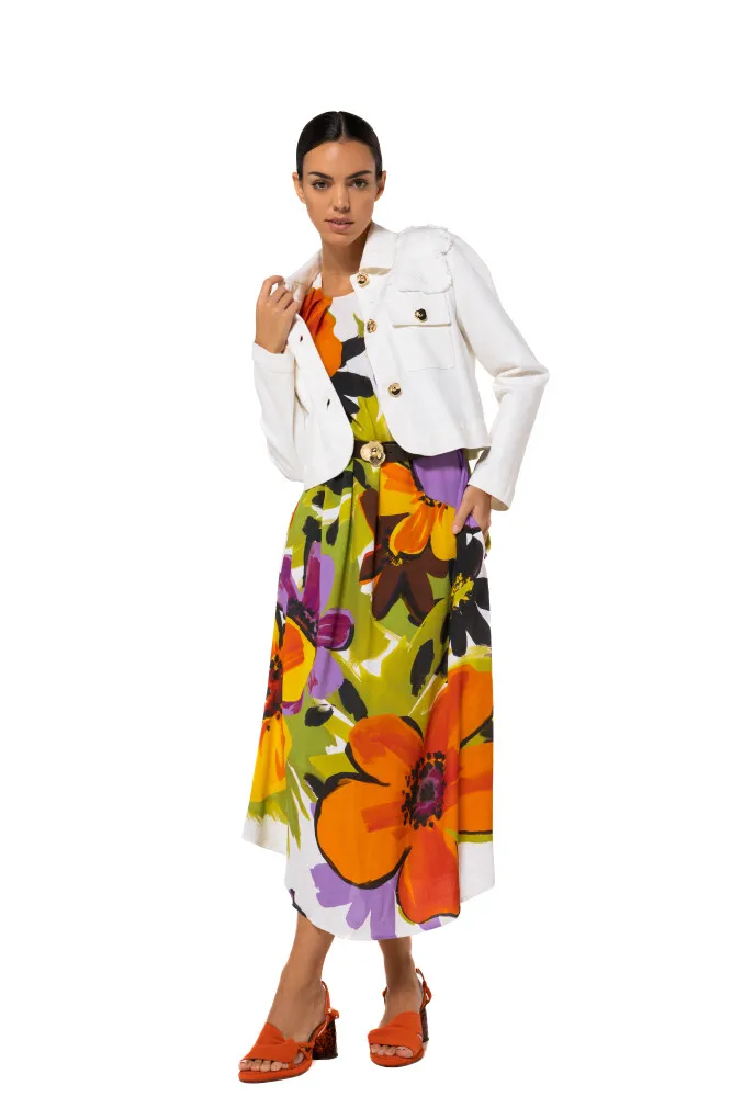 Cette robe midi sans manches attire le regard avec son imprimé floral expressif et sa texture crêpe au tombé léger. Les épaulettes structurent subtilement la silhouette, tandis que la ceinture souligne la taille avec élégance. Au dos, une fermeture goutte boutonnée au niveau de l’encolure apporte une finition délicate. Dotée de poches fendues discrètes dans la couture latérale, cette robe midi conjugue style et praticité pour une allure moderne et affirmée.